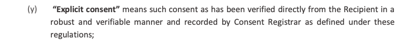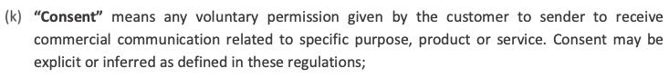 TCCCPR explicitly defines “consent” as a customer’s clear and verifiable agreement to receive commercial communication from a specific sender for a specified purpose.